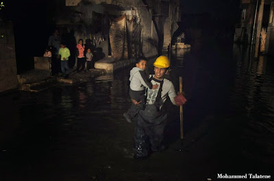 Palestinian worker carries a boy walking down the street flooded with sewage in the Sabra neighborhood in Gaza City. Photo by Mohammed Talatene, 13 Nov 2013.