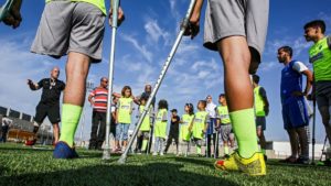 Palestinian child amputees take part in a football training session overseen by Irish coach Simon Baker (L), general secretary of the European Amputee Football Federation, in Deir el-Balah in the central Gaza Strip, on October 18, 2019. – The training is part of an initiative organised by the International Committee of the Red Cross in the Gaza Strip.