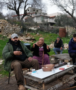 Left, Bilal Dar Khalil and his mother, Khadra, and second from right, activist Ayad Raffari, in Sinjil, January 2026