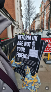 Picketers held signs reading “antifascism is a Jewish tradition,” “Reform U.K. are not your friends,” and displayed alleged quotes from Farage that used Nazi-affiliated rhetoric.  Max Hammer, a spokesperson for Na’amod, told Haaretz that the protesters’ goal was to oppose the event held by Farage and his “racist rhetoric.”