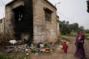 Yasmin al-Tirawi and her children walk around their house, set on fire by Israeli settlers in the West Bank village of Burin on 3 February 2025