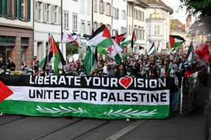 Protestors hold a banner and Palestinian flags during a demonstration against Israel’s candidate prior to the grand final of the Eurovision Song Contest 2025 in Basel on 17 May 2025