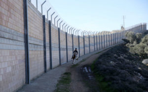 A Palestinian boy rides a horse near the separation wall at Rafat on 3 February 2019
