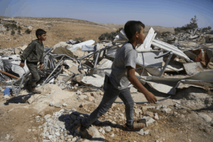 Palestinian children walk through rubble following Israeli army demolitions in the village of Khalet al-Daba, Masafer Yatta, southern West Bank, 18 September 2025