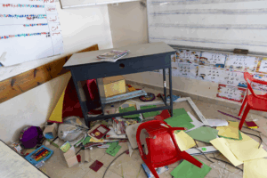 Damage to a classroom following a large-scale attack by Israeli settlers and soldiers, in the village of Jinba, Masafer Yatta, southern West Bank, 3 April 2025