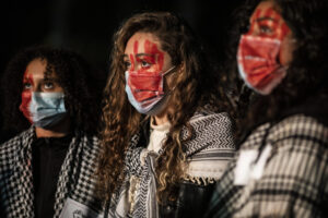 Limor Abu Dieb,15, (C), Malaka Abu Kishil,14 (L) and Heba Abu Shakif,14, painted their faces with red hands to symbolize the bloodshed in their community in a protest held at Tel Aviv’s Rabin Square on 18 March 2021