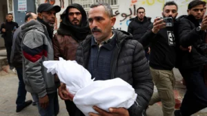 A mourner carries the body of a Palestinian infant killed by an Israeli strike, al-Shifa Hospital in Gaza City, 4 February 2026