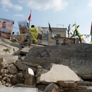 Signs of mourning and suffering are palpable here: in the bereavement that pervades Fouad’s home; in the modest memorial at the other end of the village – a flag of Palestine spread over a patch of blood-soaked earth, encircled by stones – that marks the spot where the IDF’s second victim that same night, 23-year-old Mohammad Hoshiyeh, from a neighboring village, was killed; and at Ibn Sina Hospital in Jenin, where physicians were still treating an 18-year-old Kafr Dan resident, Iz a-Din Abed, who was seriously wounded that same night. And then there are the two heaps of rubble that Israeli troops left behind this week – remnants of the homes of the families of Palestinian fighters who took part in an attack at the nearby Jalameh checkpoint on September 14. Across from the mounds, villagers were sitting in plastic chairs, mourning the destruction of their homes as people in mourning tents grieve for their dead.