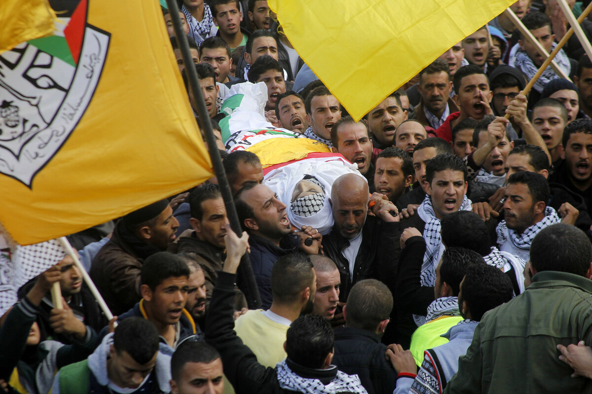 Mourners carry the body of Muayyad Jabarin during his funeral in the West Bank village of Sair, east of Hebron, on 15 January 2016. The 20-year-old man was shot dead the previous day after he allegedly attempted to stab Israeli soldiers at the Beit Einoun junction near Hebron. Photo by Wisam Hashlamoun, APA images