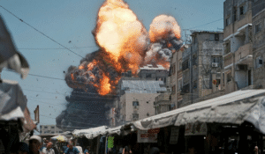 Thick smoke and flames erupt from an Israeli airstrike in Gaza City in July 2025