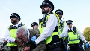 Police officers detain a protester during a mass demonstration organised by Defend Our Juries, against the British government’s ban on Palestine Action, London, 4 October 2025