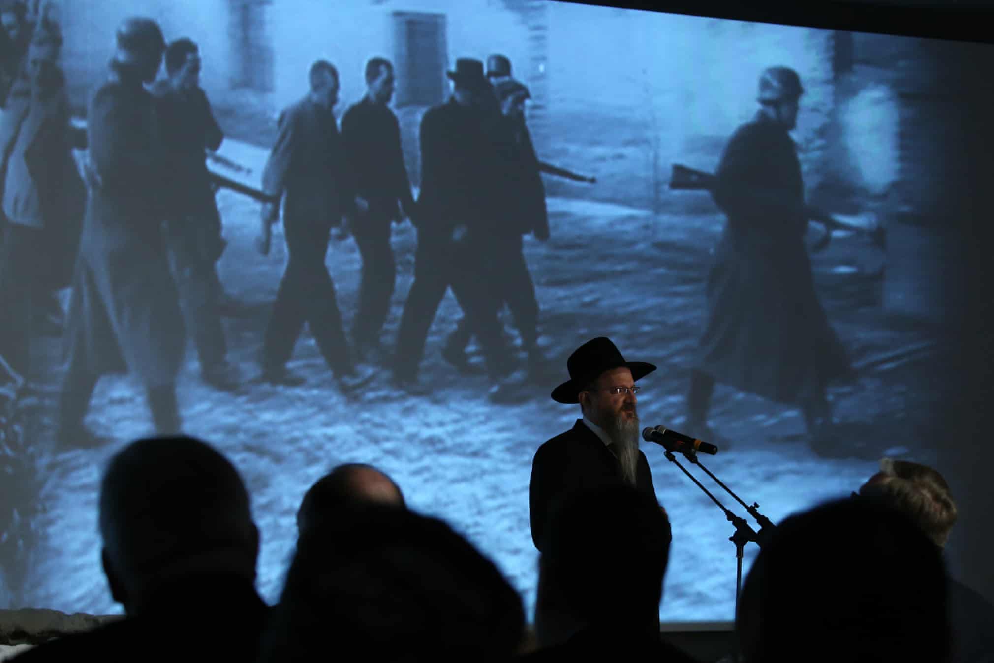 Russia’s chief rabbi, Berel Lazar, speaks in front of a film screen at a ceremony at the Jewish Museum and Tolerance Centre in Moscow. Photo by Artyom Geodakyan/TASS