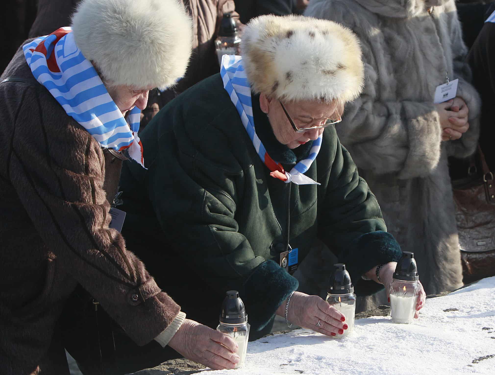 Holocaust survivors light candles at the International Monument to the Victims of Fascism in Oświęcim, Poland. Photo by Czarek Sokołowski/AP