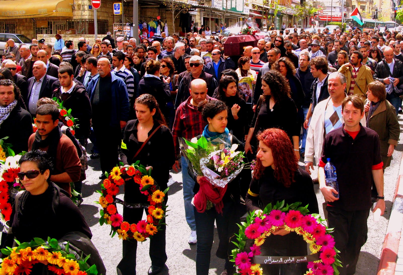 Inside the theatre, Juliano was mourned by his colleagues and students, but in the camp people were silent. The streets weren’t flooded with people holding up his picture or waving Palestinian flags, as they usually are when a martyr dies. When a group from the theatre went to the city to light candles in his memory, people asked why they were crying for a Jew. The camp seemed to be in a hurry to forget him. In Haifa, he was given a martyr’s funeral. The service was mostly in Arabic, the only flags on display were Palestinian, and speaker after speaker – including Zubeidi, who addressed the crowd via mobile phone – praised him as a Palestinian hero.