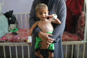 A Palestinian child suffering from malnutrition is treated at the Al-Aqsa Martyrs Hospital in Deir el-Balah, Gaza, on 11 August 2025