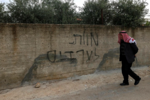 A Palestinian man walks past Hebrew graffiti that reads ‘Death to Arabs’ on the wall of a home damaged house in a reported attack by Israeli settlers in the village of Deir al-Hatab, near Nablus in the West Bank, March 2026