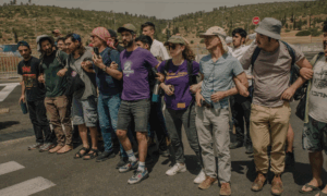Alon-Lee Green, centre, and other Standing Together activists block settlers at the Tarqumiya checkpoint from stopping aid trucks travelling to Gaza.