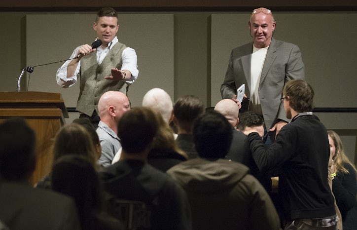 Spencer, who leads the National Policy Institute, a hate group that advocates a “peaceful ethnic cleansing,” according to the Southern Poverty Law Center, drew headlines last month when he led a crowd in Hitler salutes, chanting “Heil Trump!” just feet away from the White House.