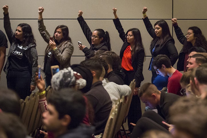 Protesters stand silently with their fists raised as Richard Spencer speaks at the Memorial Student Center. Photo by Smiley N. Pool/Staff Photographer
