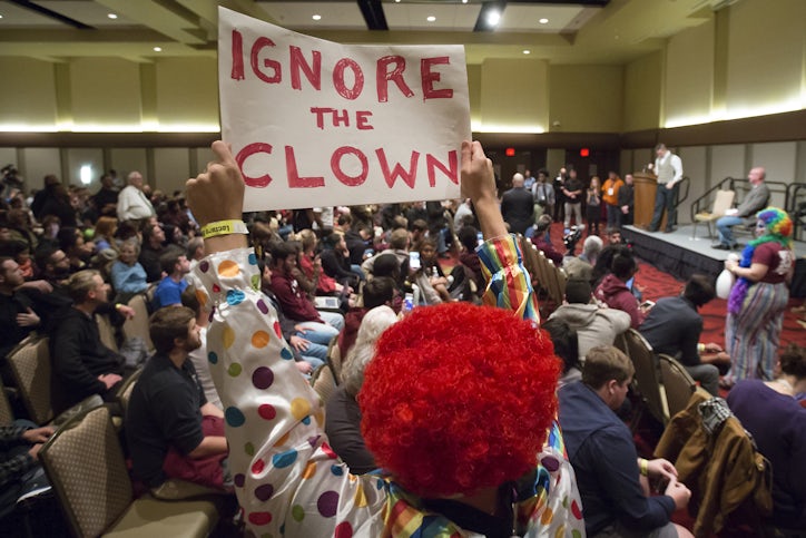 The protest, which united four disparate groups, was the largest on the campus in decades, reports the local newspaper Eagle. Some 400 students entered the building to attend Spencer’s lecture, but MSNBC reports that his fans only numbered a dozen, with the vast majority speaking out or covering it as press, including a reporter for the neo-Nazi newspaper Daily Stormer. One protester, dressed in a clown costume, stood by Spencer’s side as he spoke, and held a sign that read: “He’s the real Bozo.” A counter-rally for diversity drew thousands to Kyle Field, a 100,000-seat football field off campus.