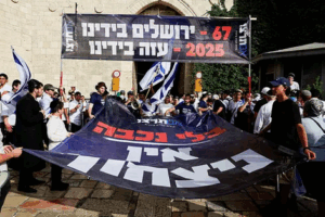Israeli right-wing group Im Tirtzu holds banner saying ‘No victory without a Nakba’ during the Jerusalem Day march in May 2025