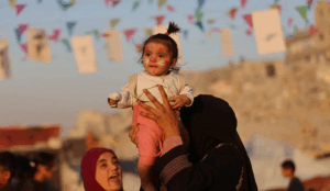 A Palestinian refugee holds a baby during the Gaza Children’s Film Festival, organized by the Masharawi Film Fund, in Al-Shatee refugee camp, west of Gaza City, on 23 November 2025
