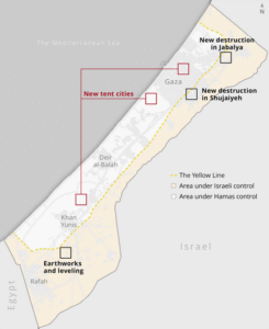 These include the entrenchment of the Israel Defense Forces along the border of its area of control in the Strip. This border – known as the Yellow Line – in some cases extends hundreds of meters into territory that is officially supposed to be under Hamas control. The images also show zones of destruction that have expanded since the cease-fire began, including in the Jabalya area and the Shujaiyeh neighborhood, both within and beyond the area under IDF control.