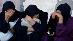 Mourners at the funeral of Palestinians who were killed in Israeli strikes on 22 November 2025, Al-Aqsa Martyrs Hospital, Deir al-Balah, central Gaza, on 23 November 2025