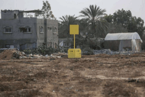 A concrete block marking the ‘Yellow Line’ drawn by the Israeli military in Bureij, central Gaza, 4 November 2025