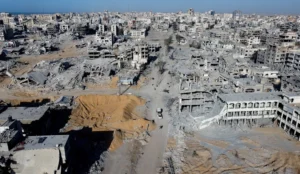 A drone view shows the destruction in a residential neighborhood of Gaza City after the withdrawal of the Israeli forces from the area, amid a ceasefire between Israel and Hamas in Gaza, 21 October 2025